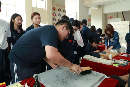 古籍保护技艺展示体验活动在综合楼一楼大厅举办,共设古籍修复、石刻拓印、雕版拓印等六项古籍修复技艺观摩体验活动,以 “观摩 + 实操” 的形式,为师生打造了一场沉浸式的传统文化盛宴。现场气氛热烈,吸引众多师生争相参与体验活动,亲自动手体验雕版印刷、碑帖传拓,学习线装书装帧制作,零距离感受古籍修复的魅力,还能带走自己的作品,同学们都是兴致满满、收获满满。