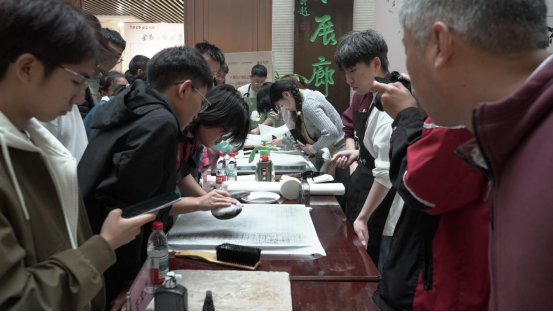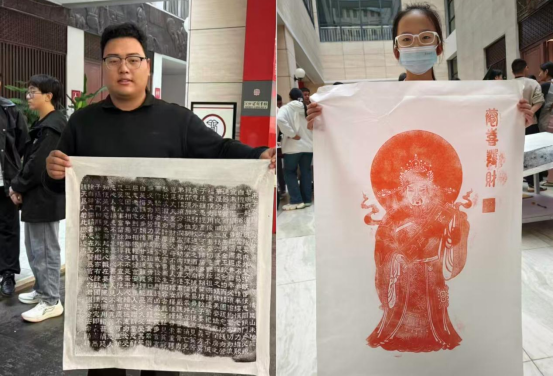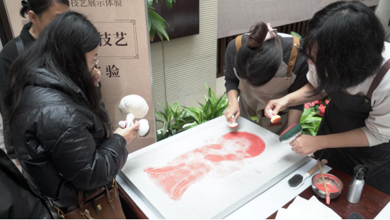 传拓技艺展示区,国家级古籍修复技艺传习中心河北传习所学徒、民间藏家们分六组对石刻、瓦当、砖刻等拓印技艺进行现场演示与教学,从上纸、捶打到上墨拓印,细致地再现传统拓印技艺的全过程。现场准备了多种拓印工具和拓印作品,激发了读者强烈的体验兴趣,在传拓专家的指导下,他们亲手制作拓片,当清晰的拓片从“石刻”上取下时欢声笑语随处可闻,这一环节吸引了众多读者争相参与,在沉浸式体验中感受传拓技艺的独特魅力。